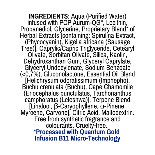 Harnessing the power of PCP Aurum-QP (processed with B11 Micro-Technology) and therapeutic botanicals, our skincare solutions target inflammation, visible signs of ageing, inflammation, and pigmentation while delivering deep hydration and nourishment. Experience the synergy of science and nature, tailored for optimal skin health and cellular renewal.